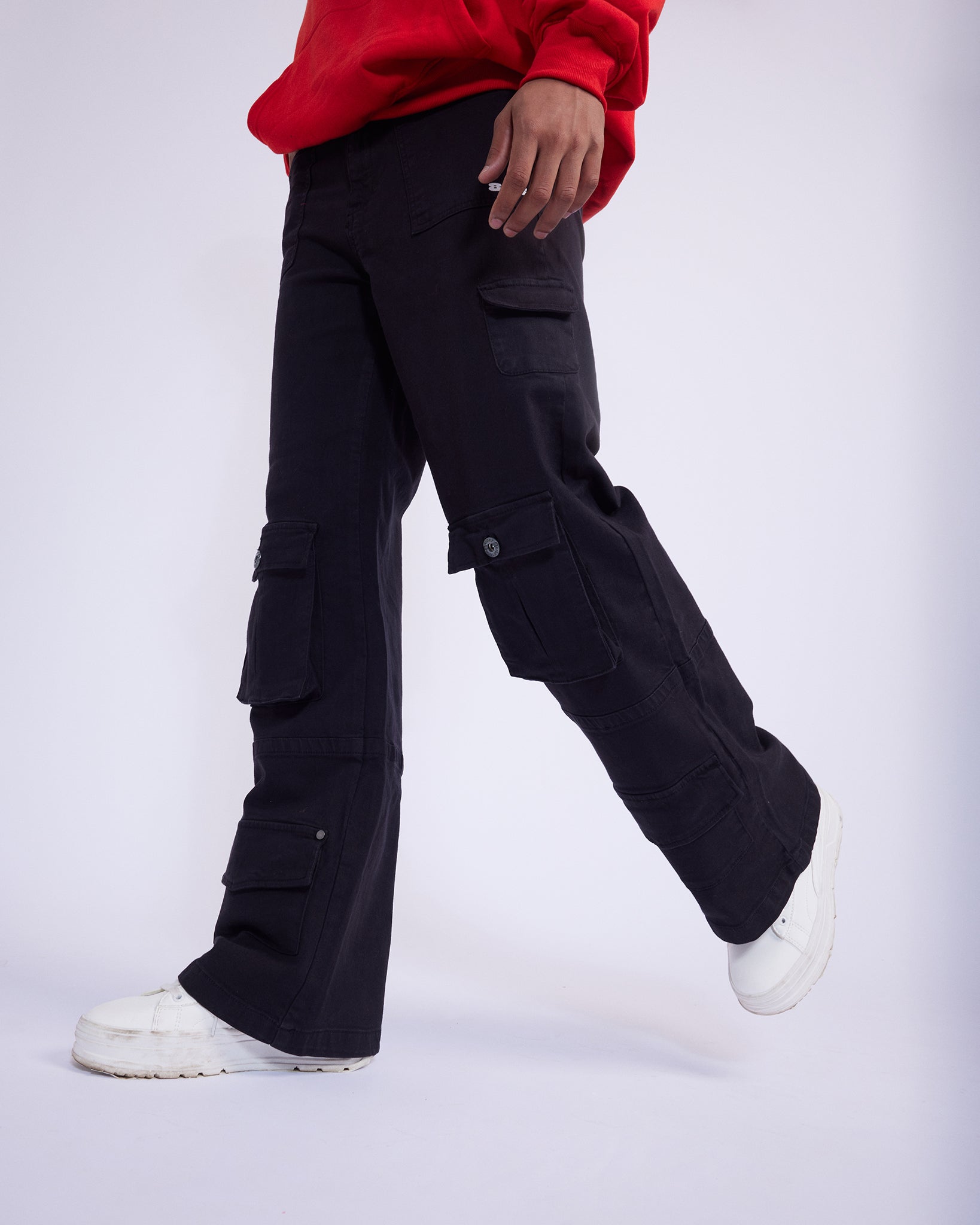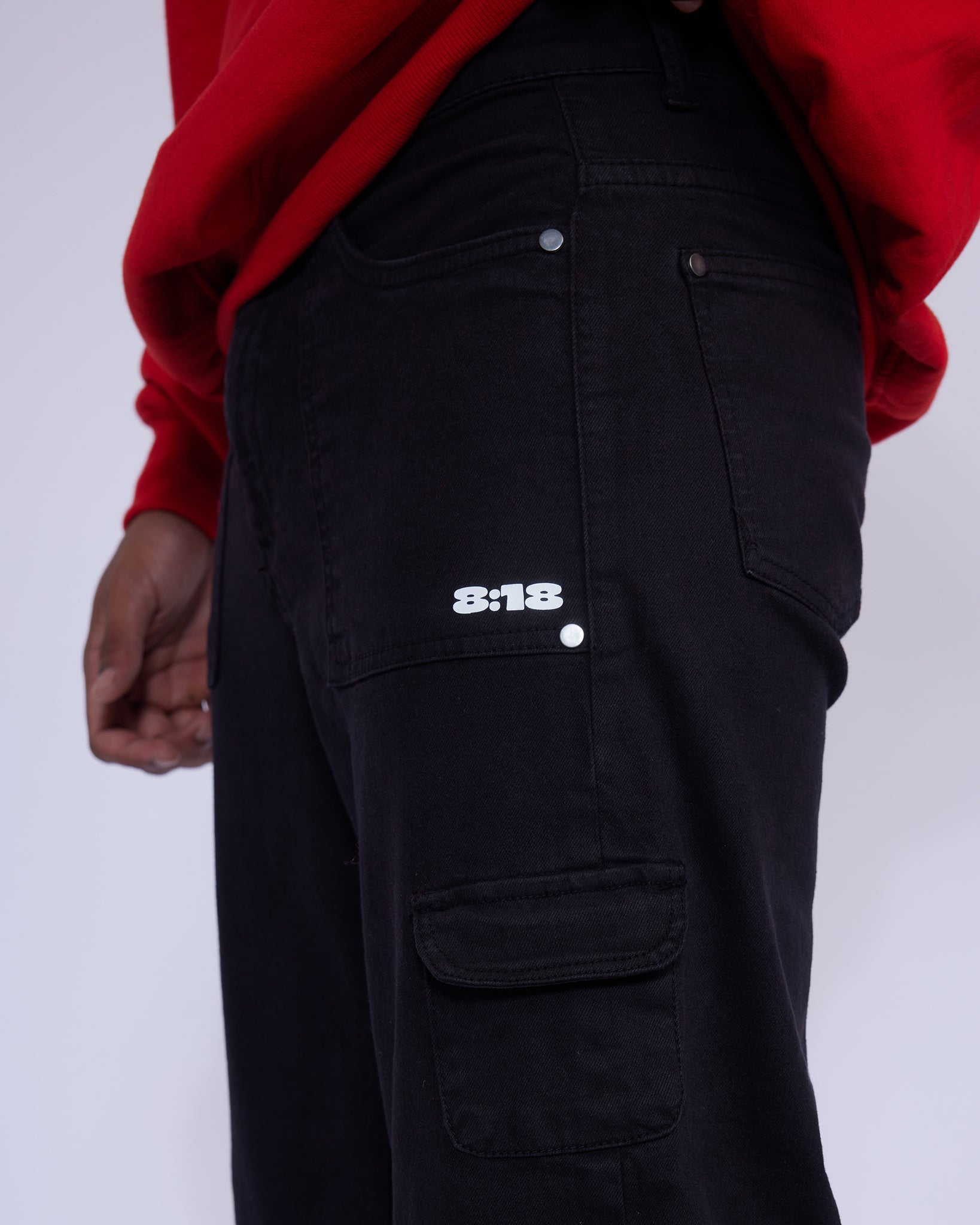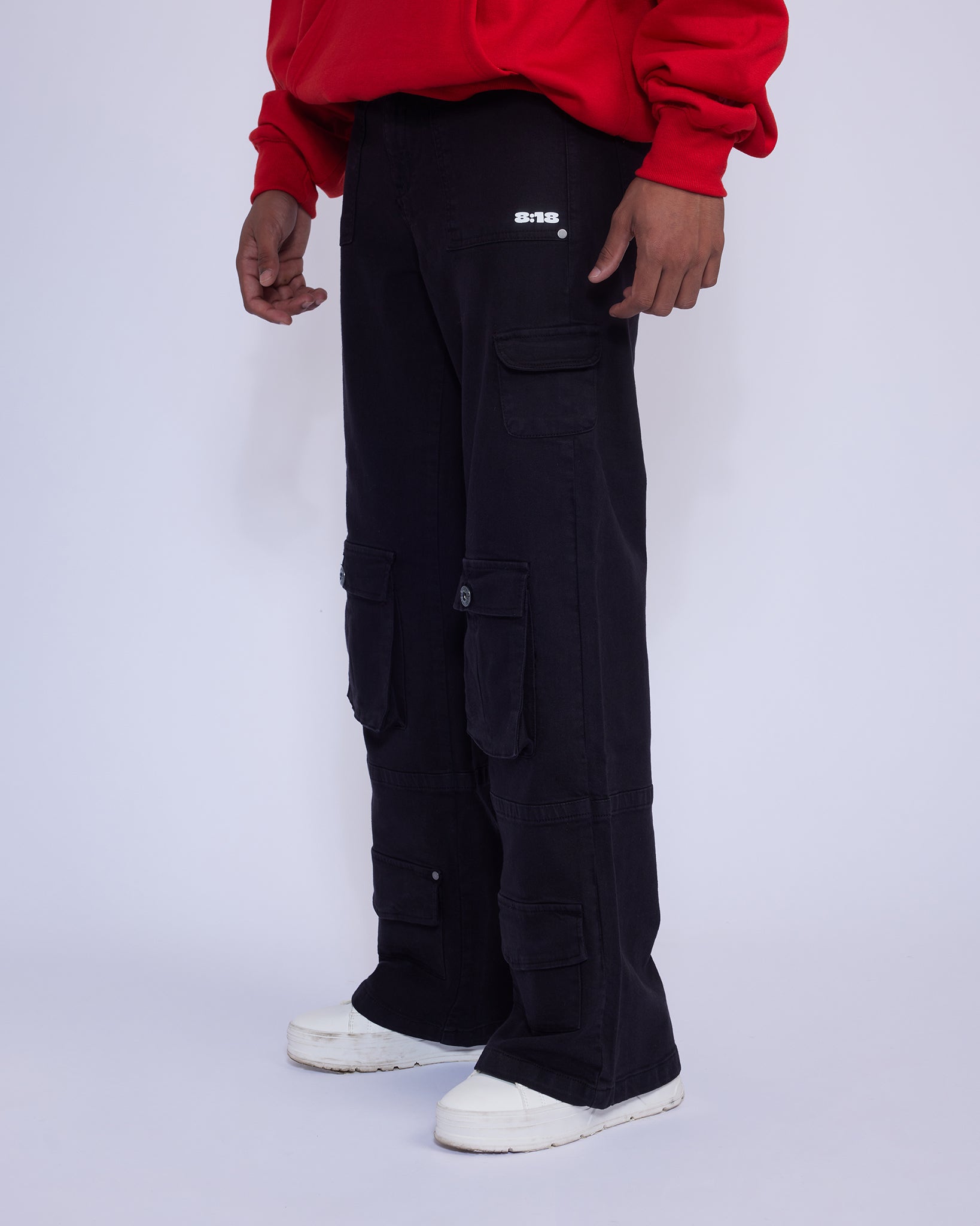 High rised, baggy wide leg fit cargo pants made with over dyed denim fabric. Belt loops, 12 pockets and a back yoke, unisex.