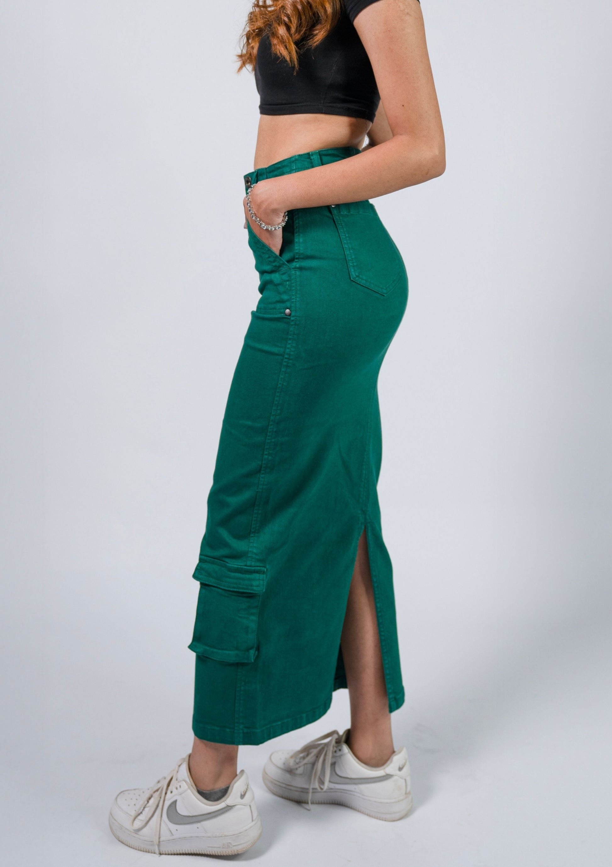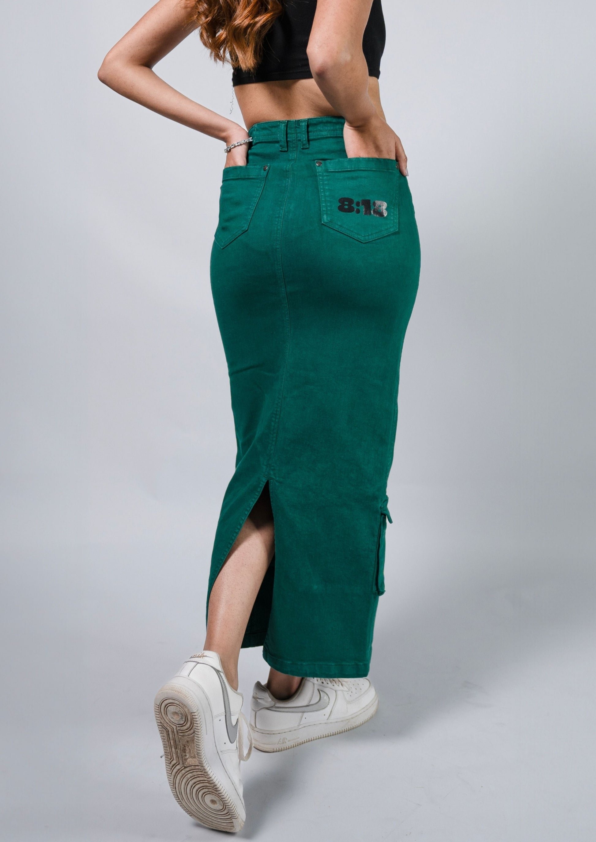 High rised ankle length denim cargo skirt with 2 cargo pockets in the front and 2 pockets on the back with an added denim belt. Print motif at the back pocket.